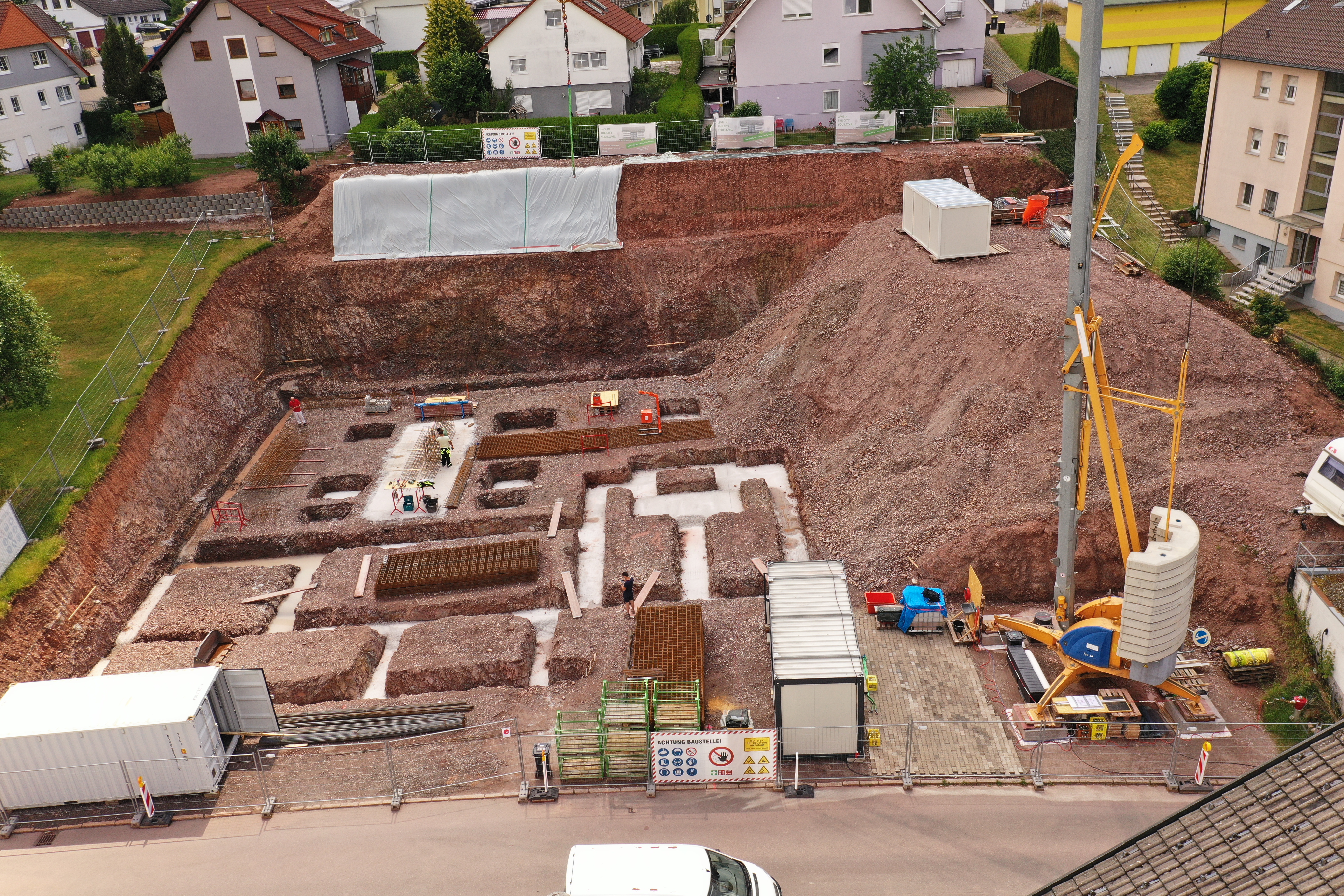 Beton- und Stahlbetonbau Benötigt wird Beton und Stahlbeton bei Bodenplatten, Weißer Wanne, Fundamenten, Decken, Stützwänden oder Pfeilern.